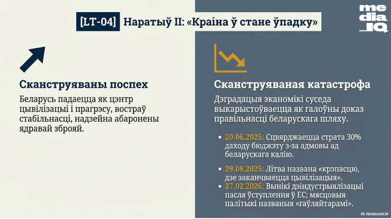 Чацвёрты наратыў — краіна ва ўпадку — выконвае функцыю адваротнага люстра, часткі вобраза «вялікага Іншага». Дэградацыя эканомікі суседа падаецца як доказ правільнасці беларускага шляху. «Порт зарос дрэвамі», «завод зачынілі», «моладзь з’ехала», «дэіндустрыялізацыя пасля ўступлення ў ЕС» — усе гэтыя выказванні служаць адной мэце: паказаць, чым заканчваецца «еўрапейскі выбар». У эфіры ад 27 лютага 2026 года літоўскія палітыкі наўпрост называліся «гаўляйтарамі», а іх краіна — тэрыторыяй, дзе «выціраюць ногі аб суверэнітэт». У эфіры ад 29 жніўня 2025 года Беларусь падавалася як сапраўдны цэнтр цывілізацыі і прагрэсу ў рэгіёне — у супрацьстаўленні Літве, якая «нічога не стварыла».