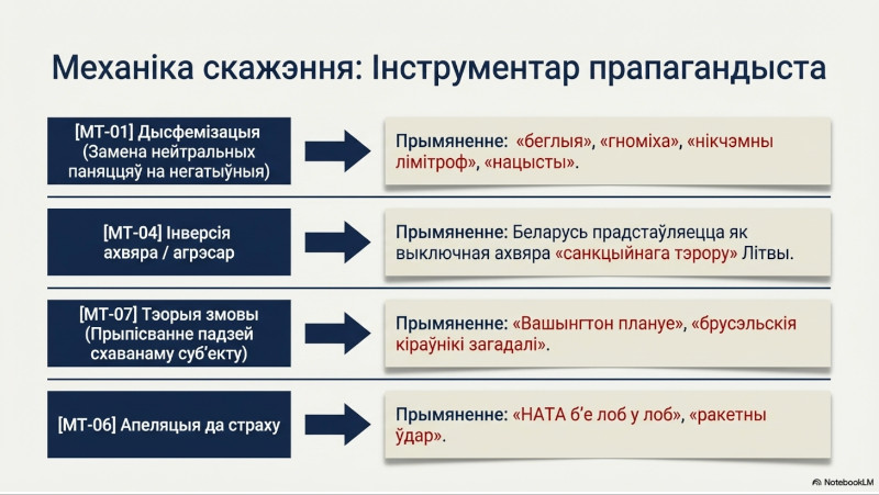 Трэці наратыў мае найбольш канкрэтны адрас: Літва як прытулак «ворагаў» — краіна, якая свядома ўтрымлівае беларускую апазіцыю. «Змагары ў Вільнюсе», «офіс Ціханоўскай», «фінансаванне беларускіх маргіналаў» — гэтыя формулы ўзнікаюць у эфіры кожны раз, калі трэба дыскрэдытаваць беларускія дэмакратычныя сілы ў выгнанні. Механізм просты: зневажальны вобраз Літвы аўтаматычна зневажае ўсіх, хто на яе тэрыторыі знаходзіцца. Дыскрэдытацыя гэтай краіны і дэгуманізацыя беларускай апазіцыі у гэтым наратыве адбываюцца адначасова. І нават калі частка працы дэмакратычных структур перамяшчаецца ў Варшаву, гэты наратыў не знікае: для прапаганды Вільня ўжо даўно не проста геаграфічны пункт, а знак беларускай палітычнай альтэрнатывы.