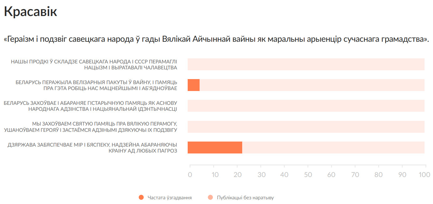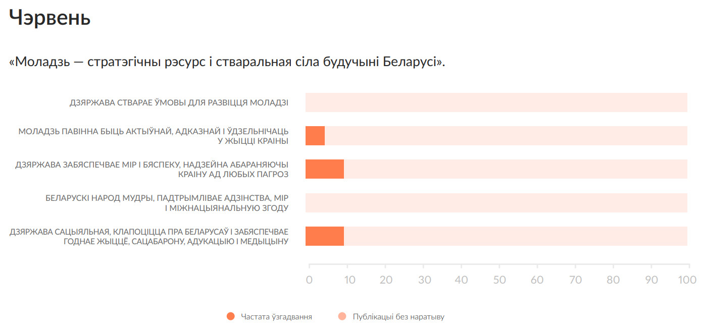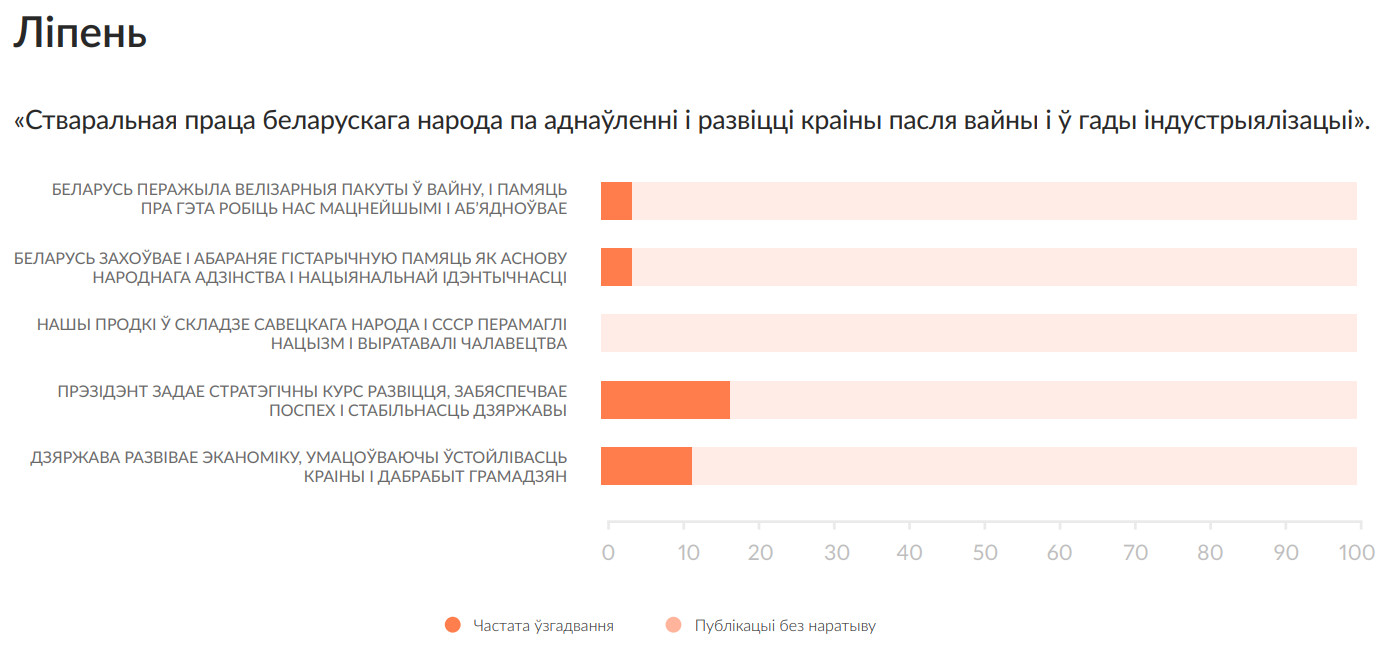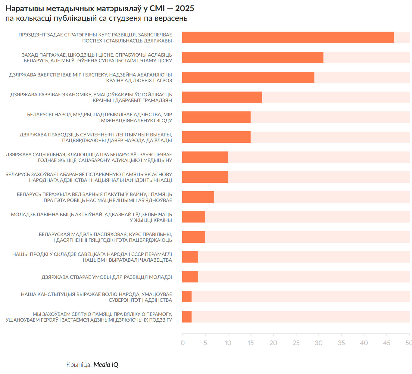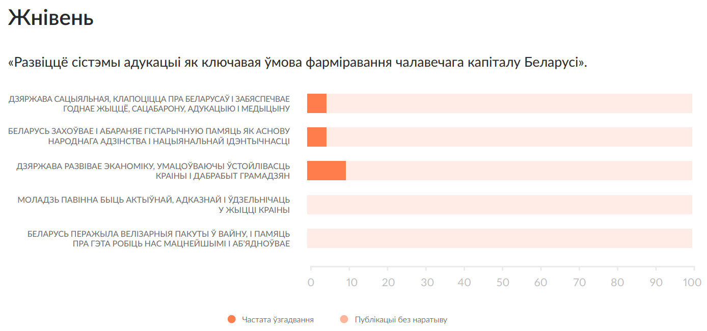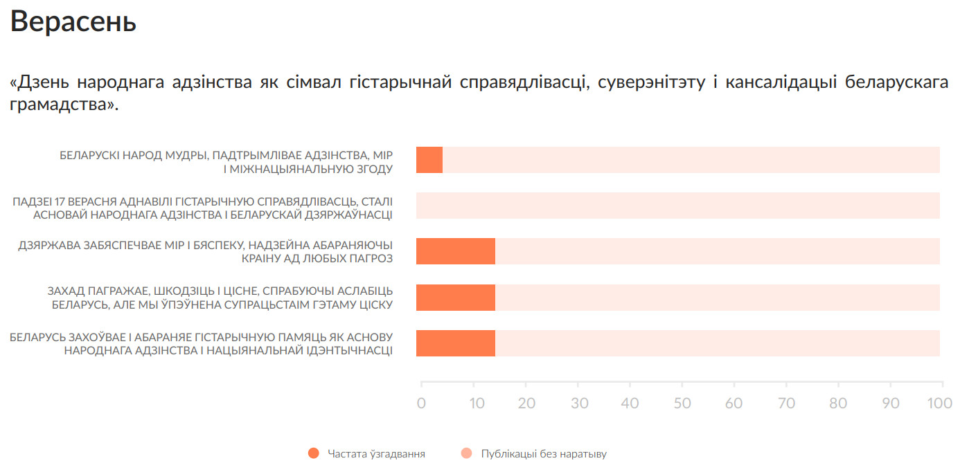 Вось якія частоты ў выбарцы публікацый СМІ за перыяд са студзеня па верасень набралі топавыя наратывы метадычных матэрыялаў. Два з іх — тактычныя наратывы «Неабходна клапаціцца пра здароўе: весці здаровы лад жыцця, займацца спортам і ўдзельнічаць у прафілактыцы» і «Падзеі 17 верасня аднавілі гістарычную справядлівасць, сталі асновай народнага адзінства і беларускай дзяржаўнасці» — не сустракаліся ў выбарцы.