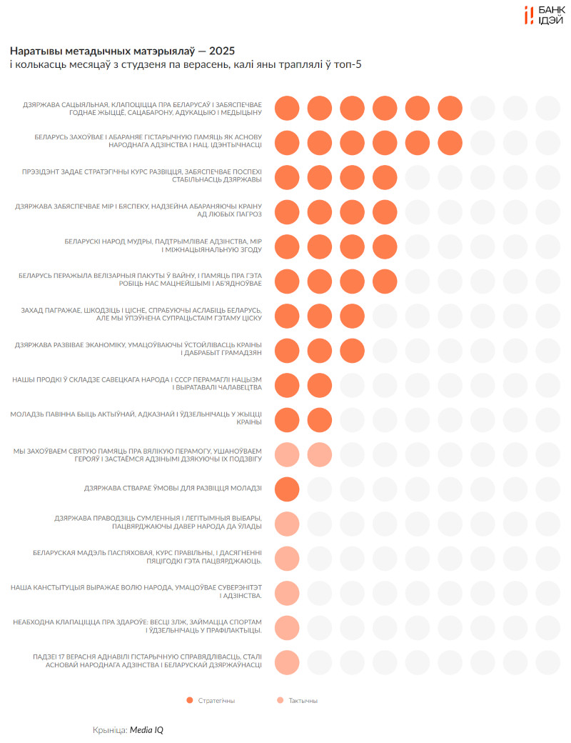 Стратэгічныя наратывы метадычных матэрыялаў слаба і нераўнамерна адлюстроўваюцца ў медыя. У метадалагічных дакументах дамінуюць доўгатэрміновыя стратэгічныя наратывы (сацыяльная дзяржава, гістарычная памяць, бяспека, лідарства Лукашэнкі), аднак іх штомесячныя «топ-5» толькі часткова адлюстроўваюцца ў СМІ. У шэрагу месяцаў ні адзін з ключавых наратываў метадычак не дасягаў у медыя парога значнай прадстаўленасці, а некаторыя тактычныя наратывы ўвогуле адсутнічалі ў выбарцы.