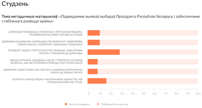 Аналіз частотнасці паказвае выразнае дамінаванне стратэгічных наратываў, перадусім звязаных з роляй Аляксандра Лукашэнкі як гаранта стабільнасці і курсу развіцця (кожная чацвёртая публікацыя), знешнімі пагрозамі з боку Захаду, а таксама тэмамі бяспекі і суверэнітэту дзяржавы. Гэтыя наратывы фарміруюць устойлівы рамкавы дыскурс і сістэмна ўзнаўляюцца ў публікацыях.