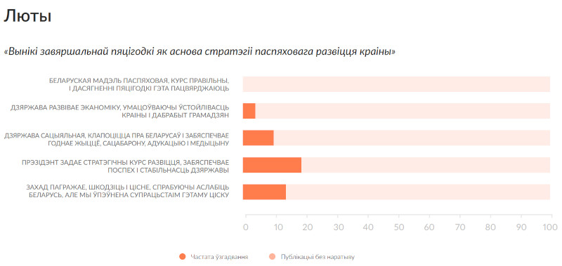 Толькі два наратывы пераадолелі парог у 20% згадванняў: услаўленне Лукашэнкі ў студзені і сакавіку, а таксама ўслаўленне здольнасці дзяржавы забяспечваць бяспеку ў красавіку.