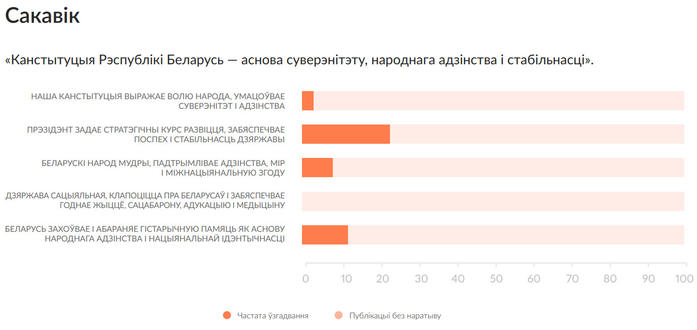 Аналіз. Тэма Канстытуцыі як інстытута аказалася для дзяржаўных СМІ не надта прывабнай. Замест гэтага сімвалам і ключавым фактарам суверэнітэту, народнага адзінства і стабільнасці ў медыядзіскурсе паказваецца Аляксандр Лукашэнка.