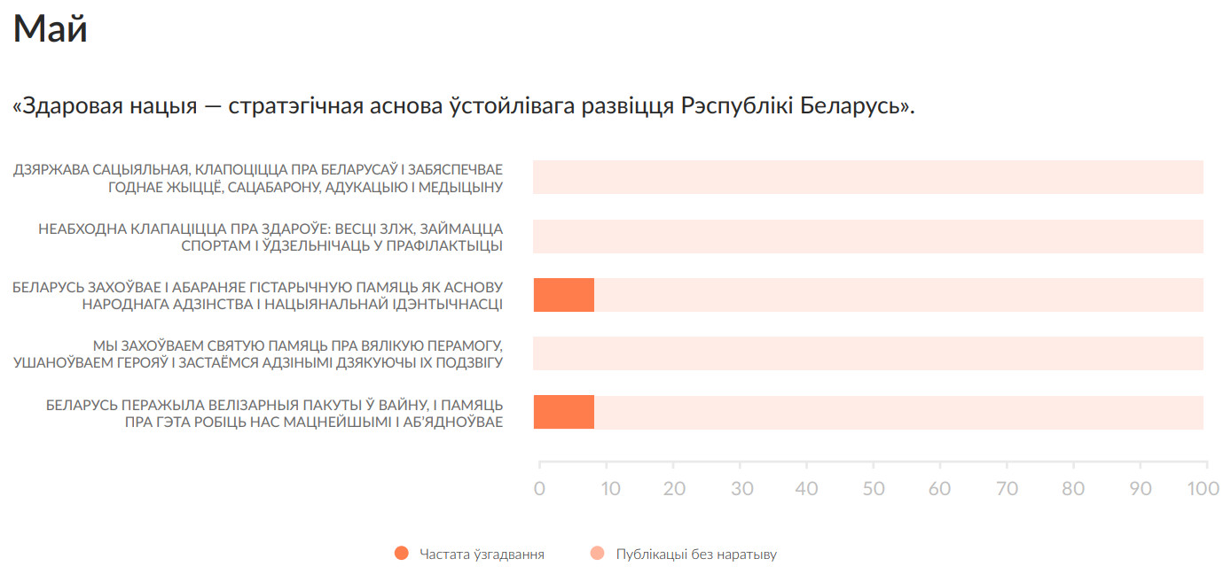 Аналіз. Тэма здароўя і намаганняў дзяржавы ў гэтай сферы не атрымала шырокай папулярнасці ў дзяржаўных СМІ. Пры гэтым тое, што было прадказальна для мая — месяца святкавання Дня Перамогі, — у дзяржаўных СМІ актыўна рэалізоўваліся наратывы, прысвечаныя Вялікай Айчыннай вайне і гістарычнай памяці.